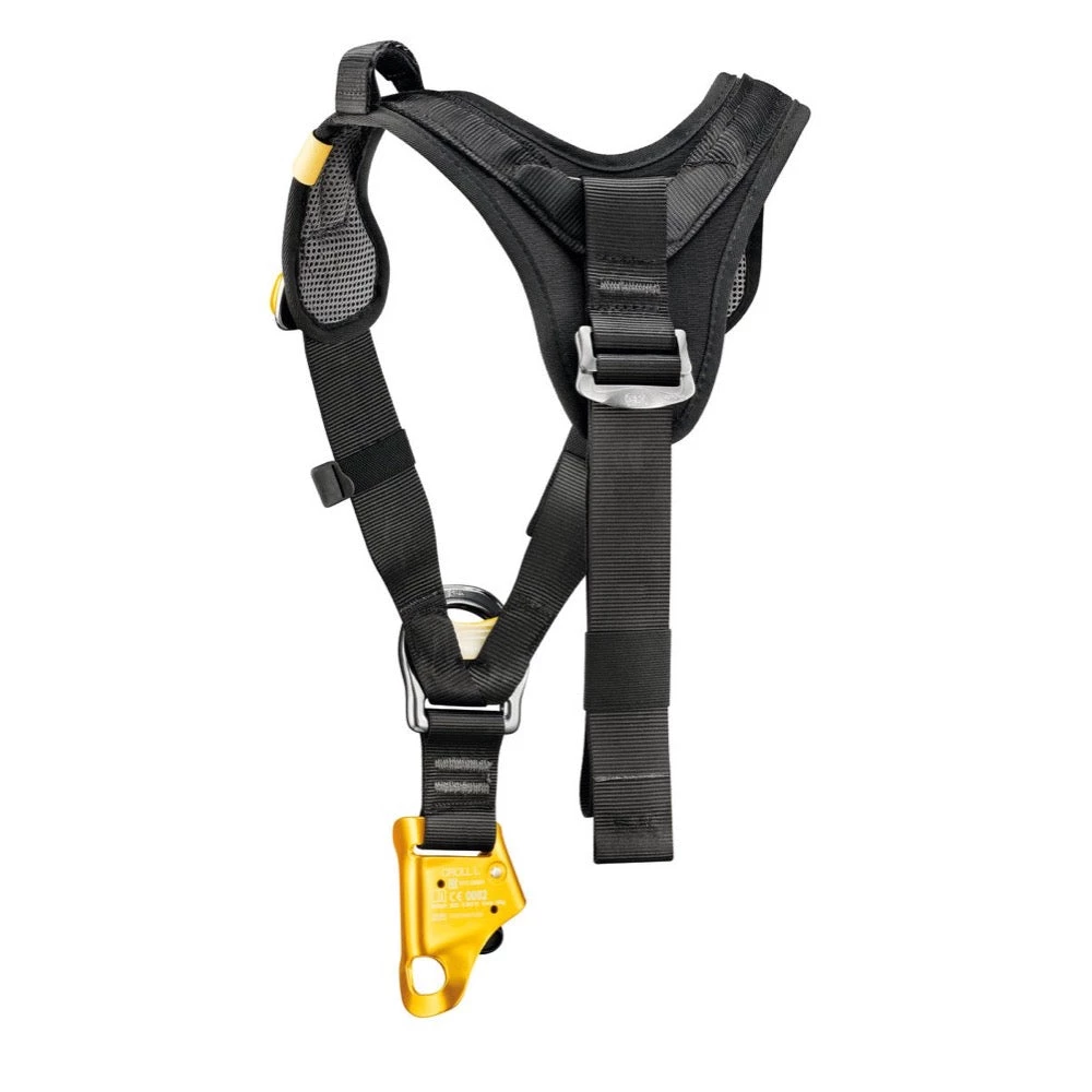 Petzl Top Croll Chest Harness. Chest harness for seat harness, with integrated CROLL ventral rope clamp. The TOP CROLL integrates a CROLL ventral rope clamp to transform the AVAO SIT, FALCON, FALCON ASCENT and SEQUOIA SRT harnesses into rope access harnesses. The foam shoulder straps are widely spaced to reduce neck chafing. When the waistbelt is loaded, they help distribute the load over the shoulders.