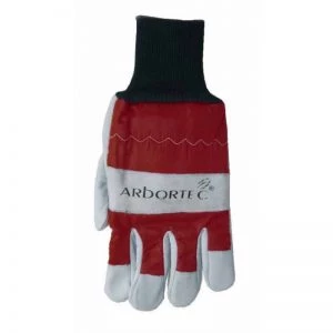 Arbortec Forestry Gloves. Area made from cowhide leather with hi-visibility nylon trim, the gloves are made from sturdy materials designed to protect the back of the left hand from chainsaw cuts.