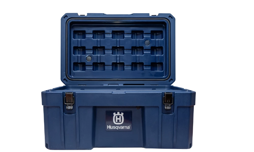 Husqvarna 76L Toolbox. Features: UV stabilised, Water, dust and impact resistant, Moulded heavy lifting points on all sides, Ratchet strap tie down points, Concealed stainless steel bottle opener.