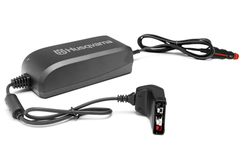 Husqvarna QC80F In Car Battery Charger – A compact Husqvarna battery charger with 12V-socket. For safe and efficient in-car charging of Li-ion BLi batteries.