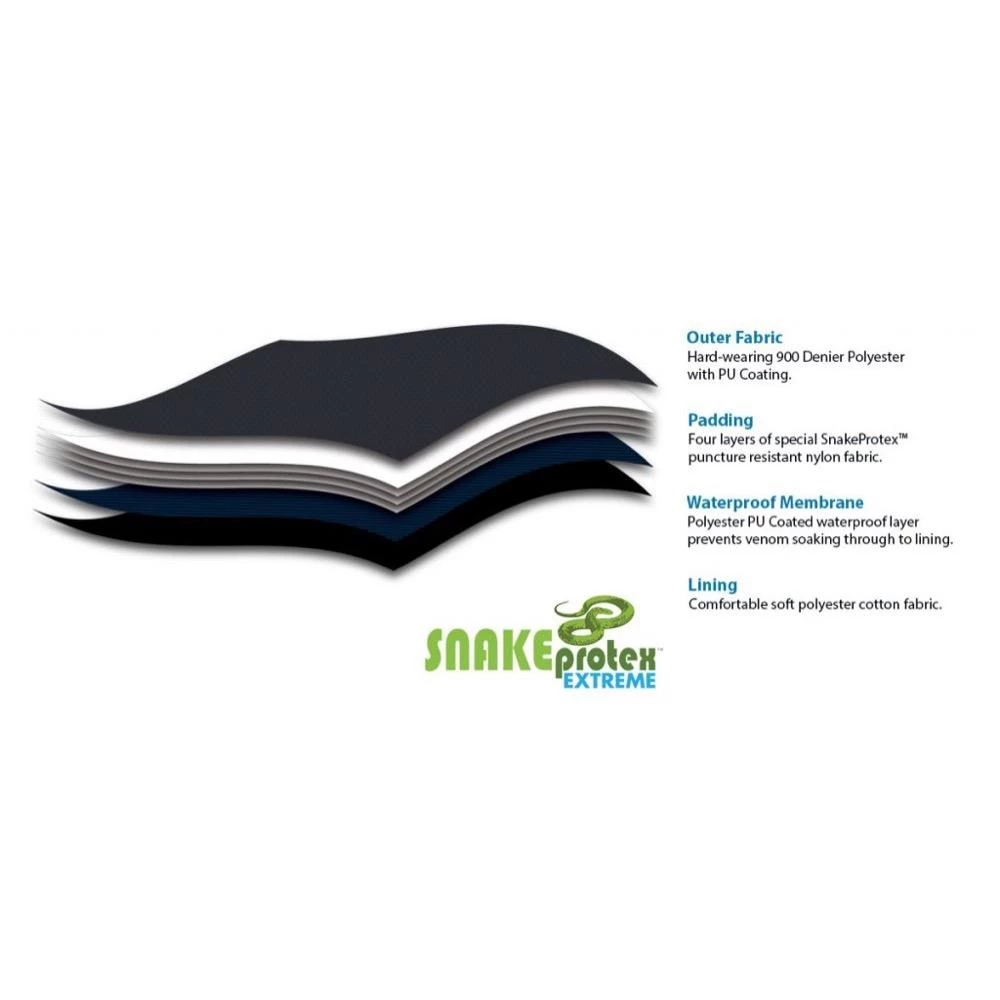 SnakeProtex Extreme SnakeProtex™ durable and lightweight gaiters are scientifically proven to protect the wearer from the world’s most venomous snakes. They outperform similar products currently available on the market globally. Sporting a range of features such as adjustable boot straps allowing for a better fit amongst a larger range of different boots and shoes, adjustable top leg straps allowing for a firmer, closer, and safer fit, SnakeProtex™ Extreme gaiters are now more versatile than ever. With its water repellent tendencies and tougher 900 weight denier external black fabric, the new gaiters now offer you even better protection from snake strikes while looking like every day work-wear and lasting the distance.