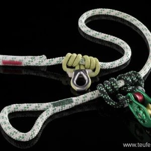 The climbing rope moves with the usual ease on the PINTO pulley. The resilient eye which facilitates the retrieval of the pulley SAVER returns to its original position even after a thousand cycles. And the pulley SAVER comes with the patented TEUFELBERGER [slaice]®. The attachment as anchor point on a tree can be implemented in four different configurations: as a swinging element in a double strand configuration, as a choke hitch, wrapped in a double strand configuration, and constricted in a double strand configuration. For the pulley SAVER, both Ocean Polyester Loop and Sirius Loop can be purchased as separate replacement parts, but not certified by a PPE standard. The breaking force rating applies to the pulley SAVER between Soft Eye and PINTO pulley and to the Ocean Polyester Loop 8 mm P when subjected to a straight-line pull under laboratory conditions in the as-new state. Diameter: 12mm X 2.5M Tensile Force: 1500/3370daN/lbs