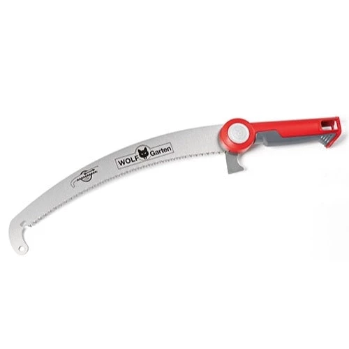 WOLF-Garten Pole Pruning Saw (Pro) (SAW PRO 370). The Wolf Pruning Saw features a 36cm serrated saw blade with double hardened teeth, great for thick branches even on high trees. The integrated professional branch hook prevents the saw from being unintentionally pulled out of the cut and the bark cutter prevents cracks and splits in the bark. Paired with the Wolf-Garten Vario handle or any multi-star handle you can work at heights up to 5.70m.